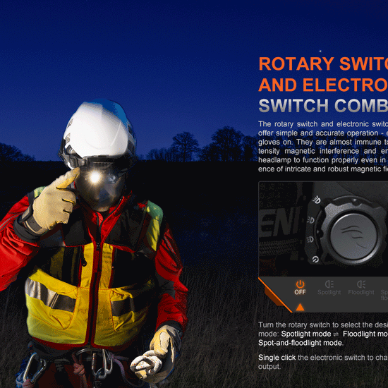 The Fenix HP35R is a USB-C rechargeable search and rescue headlamp delivering up to 4,000 lumens with versatile spotlight, floodlight, and combined beam modes. It features glove-friendly rotary and electronic switches for easy control over 12 brightness levels—four per mode—and includes a built-in red safety light for low-light visibility.