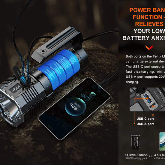 With an impressive 11-day runtime, powered by the included rechargeable battery, the LR60R is a marathon runner in the world of lights. Recharging is fast and convenient, taking only 1.5 hours to fully charge via a USB-C port. It also doubles as a power bank, allowing you to charge external devices through its USB-C or USB-A ports.