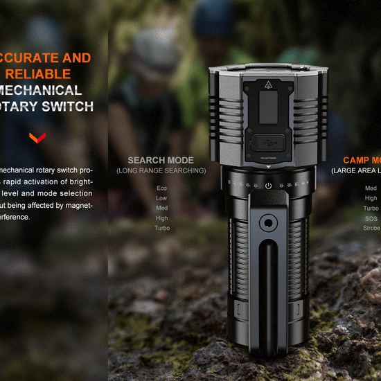 The Fenix LR60R redefines the boundaries of flashlight capabilities, boasting an awe-inspiring 21,000 lumens and 294,267 candela maximum output generating a beam distance of 3,560 ft (1085 meters). This high-end torch features an OLED smart display, a unique addition that informs you of the runtime, output, and battery percentage.
