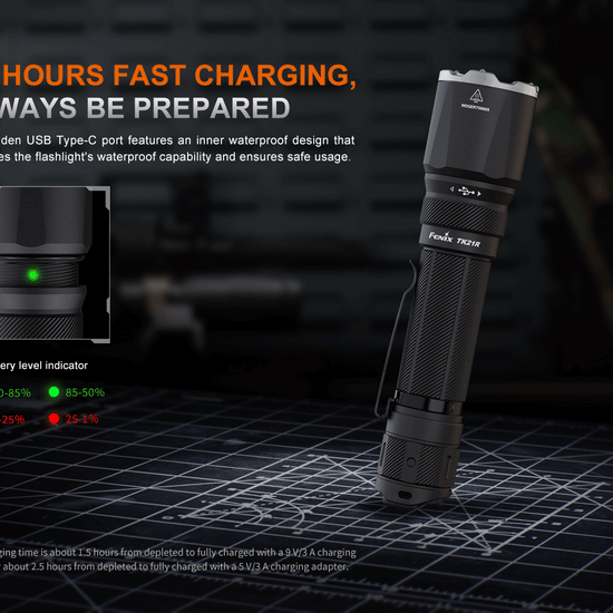 Designed for tactical efficiency, the TK21R includes an intuitive dual tail switch for seamless control of Instant Burst and Instant Strobe modes, ideal for momentary blinding or signaling in high-stakes environments. The hidden USB-C charging port and 1.5-hour fast-charging capability keep you ready for anything, while the battery level indicator ensures you’re never caught off guard.