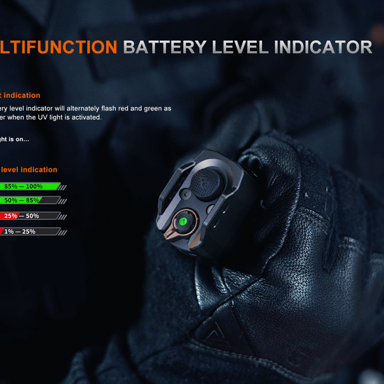 - Lighting Modes: White light (5 levels), Strobe, UV High, UV Low